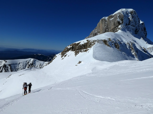 Progresamos hacia el norte por el lomo, en dirección la entrada del embudo que se ve enfrente. Hay poca nieve así que toca portear los esquís un trecho. Tras calzarnos los esquís nos dirigimos hacia el embudo. En esta parte la pendiente es pronunciada, nos obliga a poner cuchillas. Salimos del embudo pero la pendiente sigue siendo fuerte.