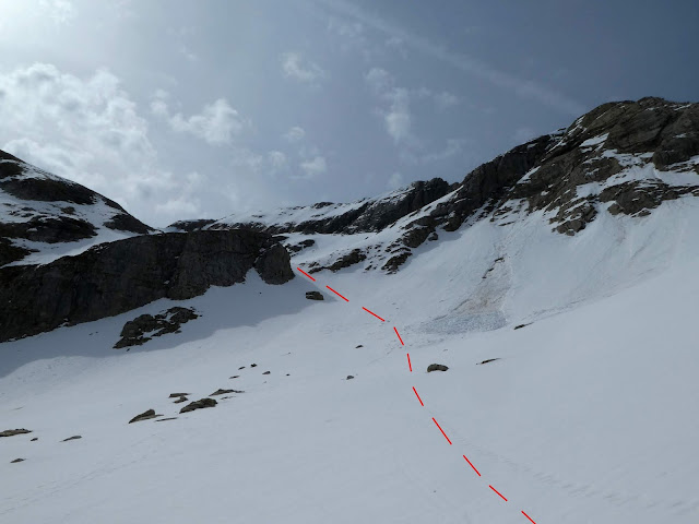 Enseguida calzo los esquis y empiezo la ascensión en dirección SO hasta llegar a una hondonada. Desde esta hondonada me dirijo al estrechamiento que tengo al sur, donde la pendiente es más pronunciada. Tras superar este estrechamiento entro en un pequeño valle suspendido, progreso un poco por el mismo y giro ligeramente a la izquierda hasta situarme en el lomo de la cresta SO que proviene de pico Escuellas.